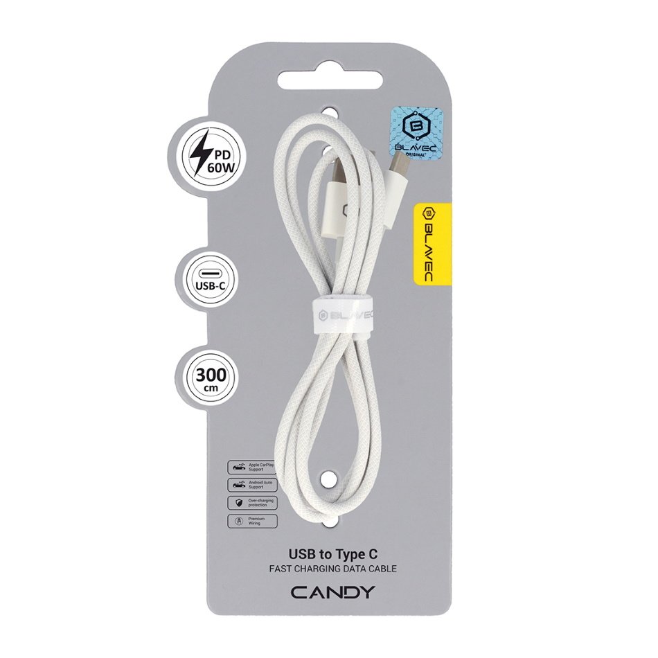 Blavec UC3W30 Candy USB podatkovno polnilni kabel 3m Type-A/Type-C 60W White